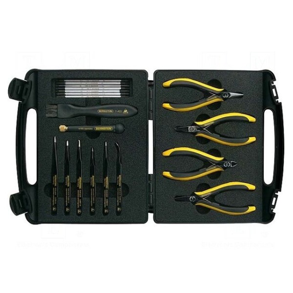 W zestawie: końcówka wkrętakowa imbusowa 1,5/3 mm, 2,5/4 mm, 2/3,5 mm, końcówka wkrętakowa krzyżowa Phillips PH000/PH00, PH0/PH1, końcówka wkrętakowa Torx T5/T6, T7/T8, T9/T10, pęseta prosta ostro zakończona 110 mm, pęseta prosta o szerokości ostrza 1,6 mm 120 mm, pęseta prosta o szerokości ostrza 1 mm 130 mm, pęseta prosta zaokrąglona o szerokości ostrza 2 mm 120 mm, pęseta zagięta 45° o szerokości ostrza 2 mm 120 mm, pęseta zagięta ostro zakończona 120 mm, szczotka o szerokości pędzla 20 mm, szczypce boczne do cięcia 120 mm, szczypce boczne do cięcia 130 mm z odgiętą końcówką tnącą, szczypce płaskie 130 mm, szczypce półokrągłe 130 mm oraz uchwyt wkrętakowy.