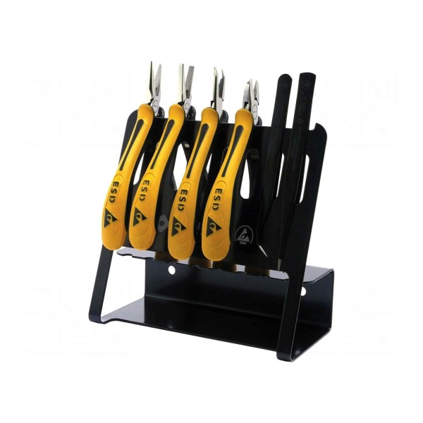 W zestawie: pęsety, stojak, szczypce. Narzędzia te umożliwiają obsługę komponentów elektronicznych w warunkach kontrolowanego rozpraszania ładunków elektrycznych.