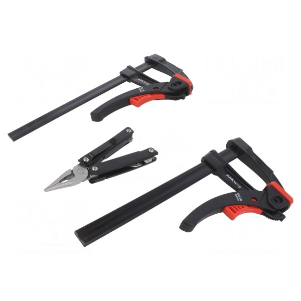 Konstrukcja w kolorze czarnym zapewnia odpowiednią sztywność podczas docisku. W zestawie: multitool, ściski.