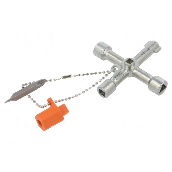 Narzędzie przeznaczone do obsługi szaf sterowniczych. Konstrukcja obejmuje klucz oraz końcówkę wkrętakową, które są ze sobą połączone łańcuszkiem zabezpieczającym, co zapobiega zgubieniu elementów zestawu.