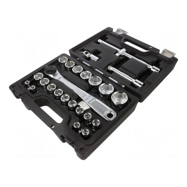 Zestaw zawiera klucze nasadowe 6-kątne z gniazdem uchwytu o rozmiarze 1/2". Komplet składa się z 25 elementów przeznaczonych do prac warsztatowych i montażowych.