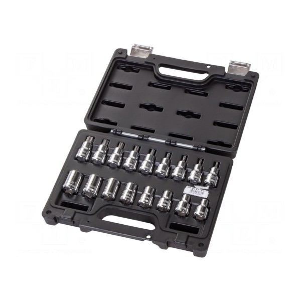 Zestaw kluczy typu nasadowego Torx obejmuje 17 elementów przeznaczonych do pracy z gniazdami o rozmiarze 1/2". Komplet został zaprojektowany do obsługi połączeń śrubowych z profilem Torx, co umożliwia skuteczne przenoszenie momentu obrotowego na elementy złączne.