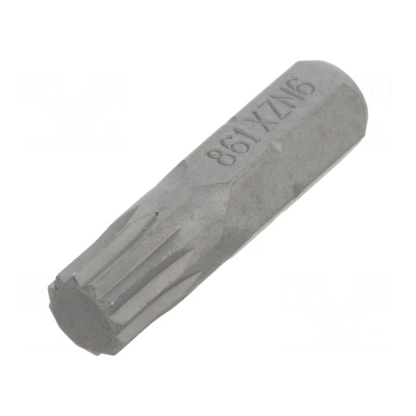 Końcówka wkrętakowa typu spline posiada profil 12-kątny w rozmiarze XZN M6. Element został zaprojektowany do współpracy z gniazdami uchwytu o wymiarze 1/4" oraz standardzie uchwytu C6,3mm.