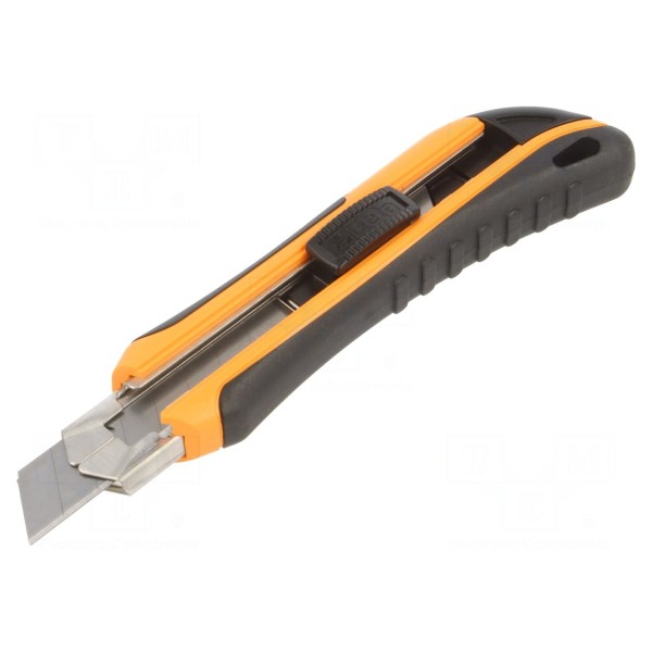 Nóż wyposażony jest w wysuwane, łamane ostrze o szerokości 18mm. Mechanizm pozwala na łatwą regulację długości wysunięcia ostrza, co umożliwia precyzyjne cięcie różnych materiałów.