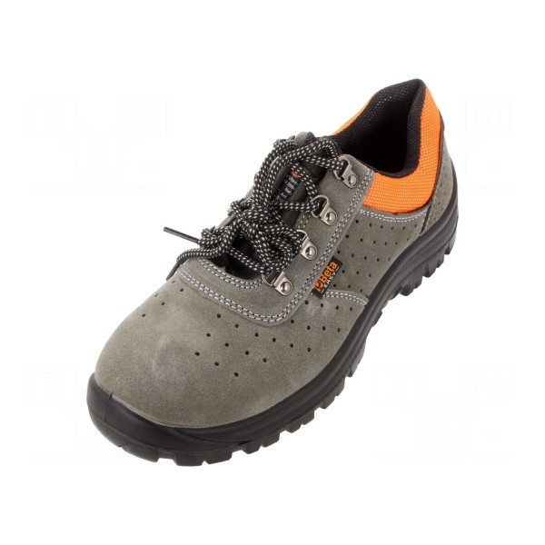Prezentowane półbuty ochronne wykonane zostały ze skóry w kolorze szaro-czarnym. Obuwie wyposażono w metalowy podnosek, który zabezpiecza palce stóp przed urazami mechanicznymi. Produkt jest zgodny z normami CE oraz EN ISO 20345:2011.