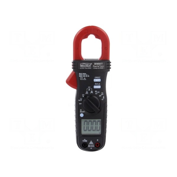 Miernik cęgowy cyfrowy BRYMEN BM037 to przyrząd wielofunkcyjny umożliwiający pomiar napięcia DC i AC w zakresie do 600V oraz prądu AC i DC do 600A. Urządzenie charakteryzuje się obsługą rzeczywistej wartości skutecznej True RMS oraz rozdzielczością wyświetlacza 6000 z próbkowaniem na poziomie 5 pomiarów na sekundę. Dodatkowo przyrząd wspiera pomiary rezystancji do 6MΩ, częstotliwości w zakresie 5–999,9Hz, pojemności do 2500µF oraz temperatury w przedziale od -40 do 400°C.