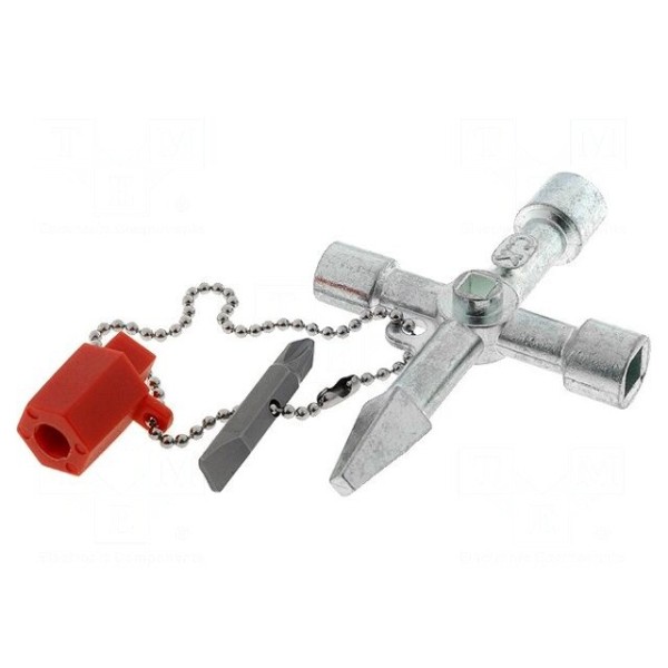 Klucz przeznaczony do obsługi szaf sterowniczych oraz systemów klimatyzacji i regałów magazynowych. Narzędzie posiada końcówki specjalistyczne w wymiarach: kwadrat 5 mm, kwadrat 7 mm, kwadrat 8 mm, trójkąt 9 mm, okrągły 6 mm oraz ostrosłup o wymiarach 4-10 mm.