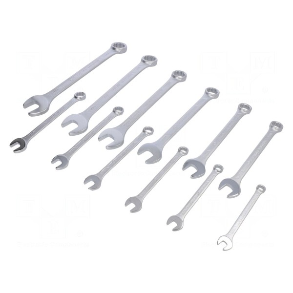 Zestaw zawiera 12 kluczy płasko-oczkowych wykonanych ze stali chromowanej. W skład kompletu wchodzą narzędzia o rozmiarach 8mm, 9mm, 10mm, 11mm, 12mm, 13mm, 14mm, 15mm, 17mm, 19mm, 21mm oraz 22mm.