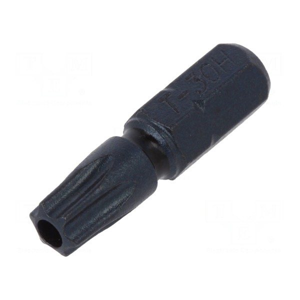 Końcówka wkrętakowa o profilu Torx z zabezpieczeniem w rozmiarze T30H przeznaczona jest do pracy z wkrętami posiadającymi gniazdo z otworem prowadzącym. Narzędzie zostało wykonane ze stali i posiada standardowy uchwyt typu C6,3mm (1/4").