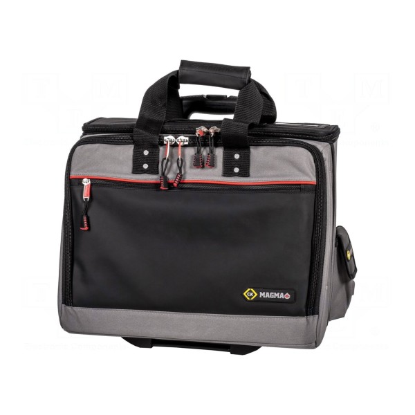 Torba narzędziowa przeznaczona jest do przechowywania oraz transportu wyposażenia technicznego. Konstrukcja modelu została wyposażona w kółka, co ułatwia przemieszczanie obciążonego pojemnika w miejscu pracy.