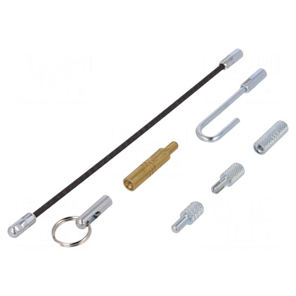 W zestawie: adapter 5mm, elastyczny przewód stalowy 190mm, hak, miniaturowe oczko i pierścień, okrągła końcówka, płaska końcówka, złączka z obrotową końcówką.