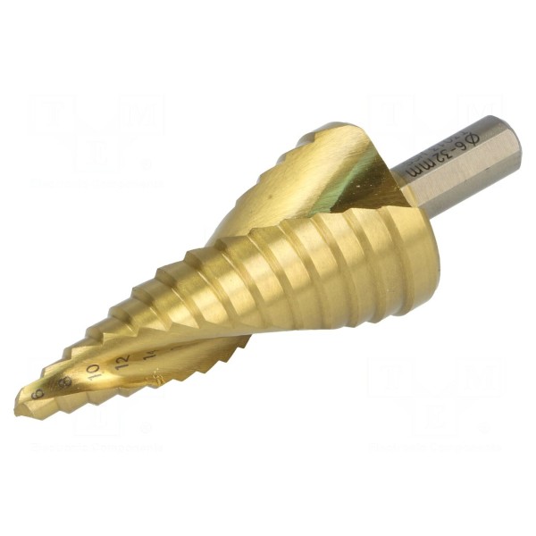 Wiertło stopniowe i stożkowe przeznaczone jest do obróbki cienkich blach. Narzędzie wykonano ze stali szybkotnącej HSS, a jego powierzchnię pokryto azotkiem tytanu, co zwiększa wytrzymałość podczas pracy. Średnica robocza urządzenia wynosi od 6 mm do 32 mm.