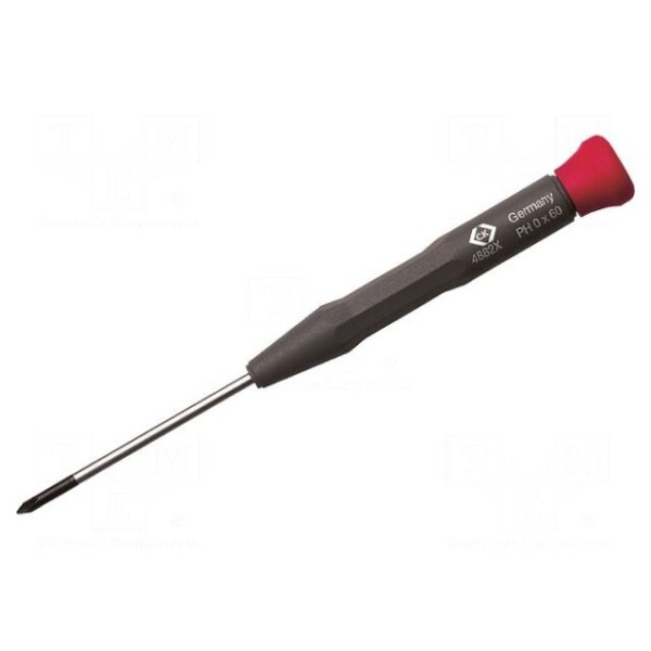 Wkrętak precyzyjny C.K T4882X 0 wyposażony jest w grot typu Phillips w rozmiarze PH0. Element roboczy charakteryzuje się długością ostrza wynoszącą 60 mm.