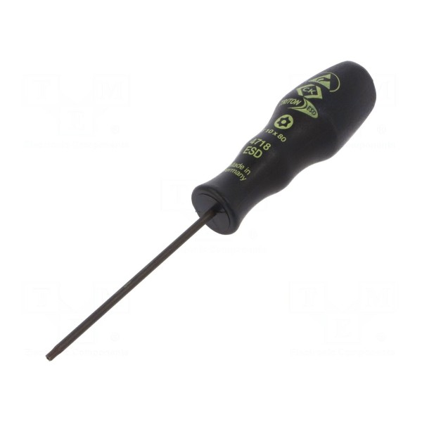 Wkrętak standardowy wyposażony w grot typu Torx z zabezpieczeniem w rozmiarze T10H. Narzędzie zostało wykonane w wersji ESD, co pozwala na bezpieczną pracę z komponentami wrażliwymi na wyładowania elektrostatyczne.