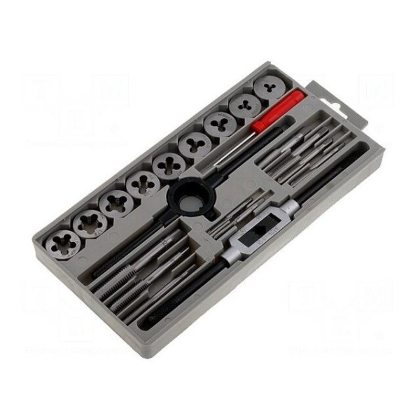W zestawie: gwintowniki, narzynki, uchwyt do gwintowników, uchwyt do narzynek, wkrętak. Komplet jest przeznaczony do wykonywania i poprawiania połączeń gwintowanych w metalach i tworzywach sztucznych.