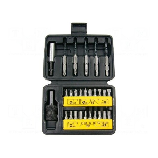 W zestawie: adapter, końcówki wkrętakowe 1/4" typu C6,3, końcówki wkrętakowe 1/4" z wiertłami oraz uniwersalny uchwyt magnetyczny. Komplet dostarczany jest w plastikowym pudełku ułatwiającym przechowywanie i organizację narzędzi.