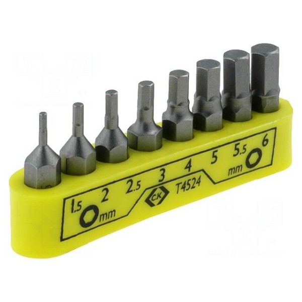 Zestaw zawiera 8 końcówek wkrętakowych typu imbus o rozmiarach HEX 1,5mm, 2mm, 2,5mm, 3mm, 4mm, 5mm, 5,5mm oraz 6mm. Narzędzia posiadają gniazdo uchwytu o rozmiarze 1/4" i typ uchwytu C6,3mm, co zapewnia kompatybilność z odpowiednimi narzędziami napędowymi.
