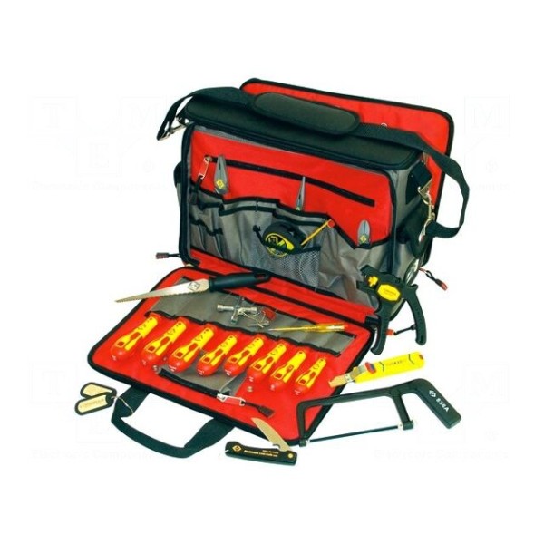 W zestawie: klucz specjalistyczny x1, mini piła do metalu 1szt, nóż dla elektryków x1, piła do płyt gipsowo-kartonowych 1 szt, próbnik napięcia, szczypce izolowane (1kV) 3 szt., taśma pomiarowa zwijana x1, torba na narzędzia x1, wkrętaki izolowane (1kV) 8 szt. Całość wyposażenia dostarczana jest w torbie, która umożliwia organizację oraz transport elementów.