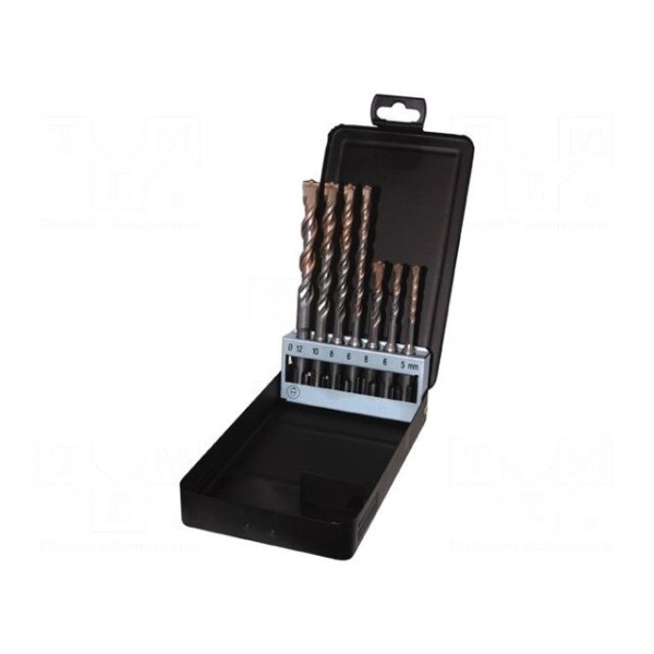 Zestaw zawiera 7 wierteł przeznaczonych do obróbki betonu. Narzędzia wykonano ze stali, a ich końcówki wzmocniono węglikiem spiekanym, co zapewnia ich przystosowanie do pracy z twardymi materiałami budowlanymi.