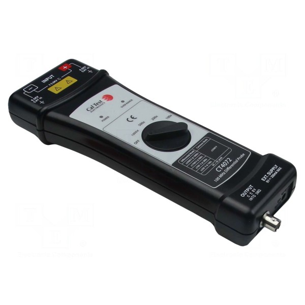 Sonda różnicowa do oscyloskopu CT4072 oferuje pasmo przenoszenia na poziomie 100MHz oraz czas narastania 3,5ns. Urządzenie pozwala na pracę z szerokim zakresem tłumienia, obejmującym wartości 100:1, 200:1, 500:1 oraz 1000:1. Maksymalne napięcie wejściowe sondy wynosi odpowiednio 350V, 700V, 1,75kV oraz 3,5kV w zależności od wybranego zakresu pracy.