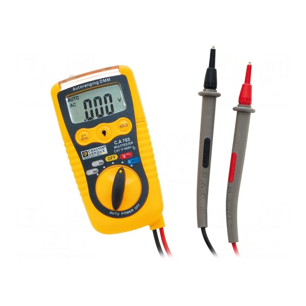 Multimetr cyfrowy CHAUVIN ARNOUX C.A 703 służy do pomiarów napięcia AC/DC, prądu AC/DC, rezystancji oraz testowania ciągłości obwodu. Urządzenie wyposażone jest w wyświetlacz LCD o parametrach 1999 oraz automatyczną zmianę zakresów pomiarowych. Dokładność pomiaru napięcia DC wynosi ±(0,5% + 3 digit), natomiast napięcia AC ±(1% + 8 digit). Pomiary prądu realizowane są w zakresach od 0,2mA do 200mA z dokładnością ±(2% + 8 digit) dla prądu stałego oraz ±(2,5% + 10 digit) dla prądu zmiennego. Rezystancja mierzona jest w zakresie do 20MΩ z dokładnością ±(0,08% + 5 digit).