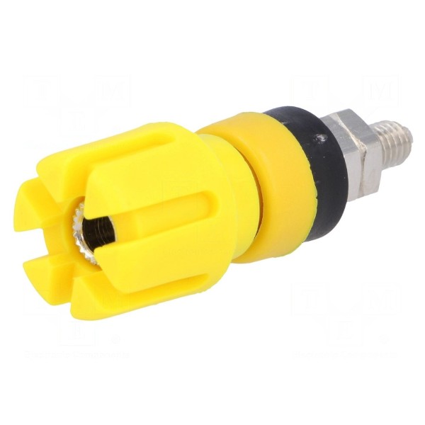 Gniazdo bananowe 4mm przeznaczone jest do montażu na panelu. Element charakteryzuje się prądem znamionowym 30A oraz napięciem znamionowym 60V DC. Konstrukcja złącza obejmuje gniazdo poprzeczne 4mm, a całość wykonano w kolorze żółtym.