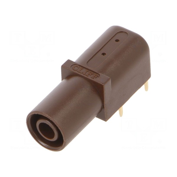 Produkt wykonany jest w kolorze brązowym i przystosowany do montażu metodą lutowania. Złącze spełnia wymogi bezpieczeństwa zgodne z normą EN 61010 oraz kategorią pomiarową CAT III 1000V.