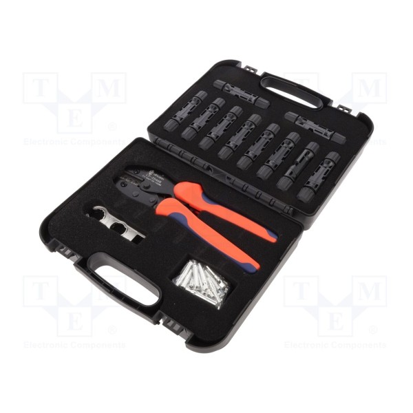 Zestaw narzędzi przeznaczony jest do prac montażowych w instalacjach fotowoltaicznych. Komplet zawiera niezbędne elementy służące do obsługi złączy solarnych MC4, co pozwala na przeprowadzenie prac instalacyjnych przez elektryków. W zestawie: klucz, zaciskarka, złącza solarne MC4. Całość przechowywana jest w etui, które ułatwia transport oraz porządkowanie narzędzi w miejscu pracy.