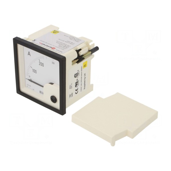 Amperomierz analogowy przeznaczony do montażu na panelu, służący do pomiaru prądu przemiennego (AC). Urządzenie obsługuje zakresy pomiarowe od 0 do 250A oraz do 500A, wykorzystując przy tym metodę pomiaru pośredniego z przekładnikiem prądowym 5A. Zastosowana technologia True RMS umożliwia określanie rzeczywistej wartości skutecznej mierzonego prądu w zakresie częstotliwości pracy od 50 do 60Hz.