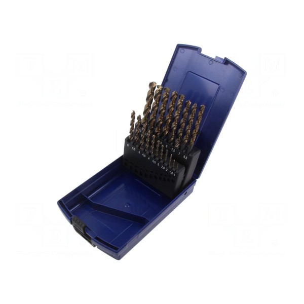 Zestaw zawiera 19 wierteł do metalu wykonanych ze stali szybkotnącej kobaltowej HSS-E. Narzędzia są przystosowane do obróbki stali, stali stopowej, aluminium oraz stopów miedzi.