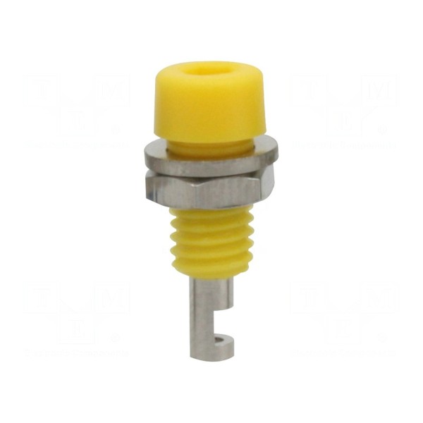 Złącze przystosowane jest do pracy w zakresie temperatur od -20°C do 80°C. Sposób montażu obejmuje połączenia lutowane oraz przykręcane, co pozwala na stabilne osadzenie elementu w panelu urządzenia. Produkt jest dostępny w kolorze żółtym.
