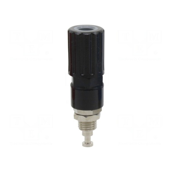Styk gniazda został wykonany z mosiądzu i poddany niklowaniu, co zapewnia parametry użytkowe elementu. Złącze przystosowane jest do pracy w zakresie temperatur od -20°C do 80°C oraz wymaga wykonania otworu montażowego o średnicy 8mm. Produkt dostępny jest w kolorze czarnym.