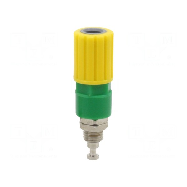 Złącze laboratoryjne typu gniazdo bananowe 4mm przeznaczone jest do montażu na panelu za pomocą połączenia śrubowego. Element charakteryzuje się prądem znamionowym wynoszącym 36A.