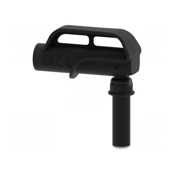 Zastosowanie obejmuje pracę z wyłącznikami różnicowoprądowymi typu RCD, RCCB oraz GFC. Element wykonany w kolorze czarnym.