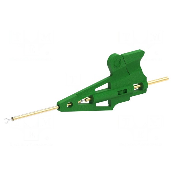 Konstrukcja elementu pozwala na chwytanie przewodów o średnicy maksymalnej 0,6mm. Wyposażony jest w gniazdo o rozmiarze 0,8mm, a jego długość całkowita wynosi 42,6mm. Produkt wykonany w kolorze zielonym.