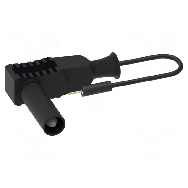 Konstrukcja przewodu obejmuje wtyk 0,8 mm oraz kątowy wtyk bananowy 4 mm, co umożliwia współpracę z kompatybilnymi gniazdami laboratoryjnymi. Produkt wykończony jest w kolorze czarnym.