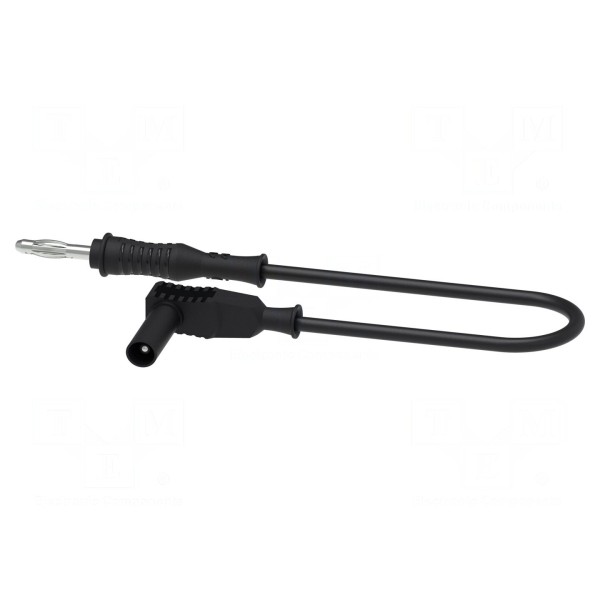 Konstrukcja przewodu obejmuje wtyk bananowy 4 mm oraz wtyk bananowy kątowy 4 mm. Żyła o przekroju 0,75 mm² pokryta jest izolacją wykonaną z PVC, zapewniającą ochronę przy zachowaniu elastyczności. Przewód jest przystosowany do pracy w zakresie temperatur od -20°C do 80°C i dostępny jest w kolorze czarnym.