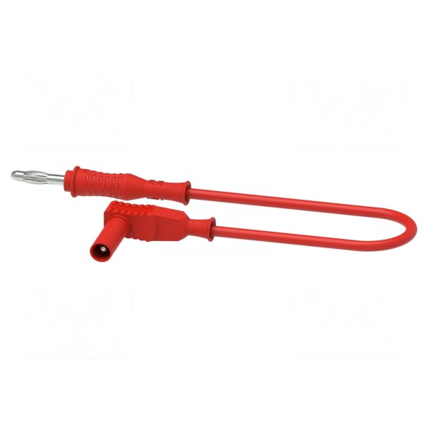 Konstrukcja kabla obejmuje proste oraz kątowe wtyki bananowe o średnicy 4 mm, które zapewniają stabilne połączenie w gniazdach laboratoryjnych. Element jest wykończony w kolorze czerwonym, co ułatwia identyfikację torów pomiarowych w instalacjach. Produkt znajduje zastosowanie w bieżących pracach pomiarowych oraz diagnostycznych wymagających trwałych połączeń w obwodach o niskim napięciu.