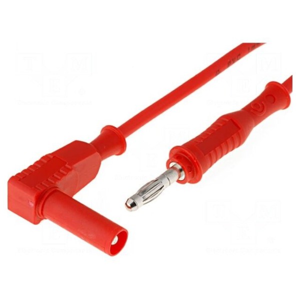 Konstrukcja przewodu o długości 1m obejmuje prosty wtyk bananowy 4mm oraz kątowy wtyk bananowy 4mm. Kabel w kolorze czerwonym przeznaczony jest do wykonywania połączeń w układach pomiarowych.
