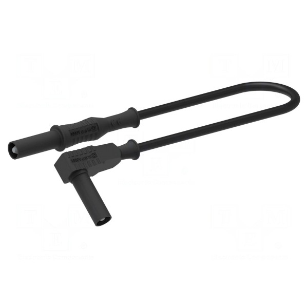 Przewód pomiarowy o długości 1,5 m został zaprojektowany do współpracy z urządzeniami wyposażonymi w standardowe gniazda bananowe 4 mm. Konstrukcja kabla obejmuje prosty wtyk bananowy 4 mm oraz kątowy wtyk bananowy 4 mm, co ułatwia podłączenie w miejscach o ograniczonej przestrzeni. Elementy stykowe wykonano z mosiądzu i poddano procesowi niklowania, co zapewnia trwałe połączenie elektryczne.