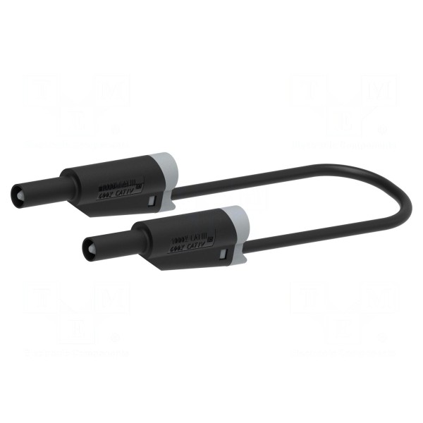 Przewód pomiarowy o długości 0,5 m wyposażony jest w izolowane wtyki bananowe 4 mm z obu stron, które posiadają zintegrowane gniazdo osiowe 4 mm. Model ten zaprojektowano do pracy z prądem znamionowym 25 A oraz napięciem znamionowym do 1 kV. Przekrój przewodu wynosi 1,5 mm².