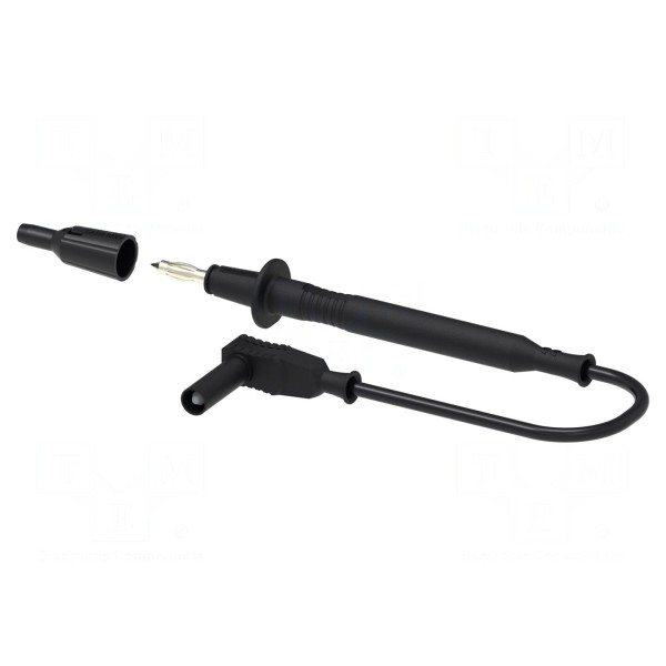 Styki elementu wykonano z mosiądzu i poddano procesowi niklowania, co wpływa na parametry połączeniowe akcesorium. Produkt spełnia wymogi bezpieczeństwa kategorii CAT III 1000V. Przewód dostępny jest w kolorze czarnym, a jego końcówki zostały zwymiarowane zgodnie ze standardem 4 mm.