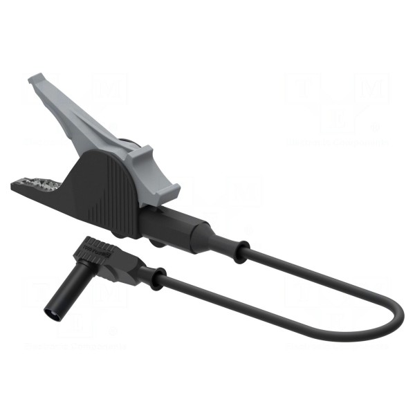 Zakończenie przewodu stanowią wtyk bananowy kątowy 4 mm oraz zacisk krokodylkowy. Elementy stykowe wykonano z mosiądzu i poddano procesowi niklowania, co wpływa na ich trwałość. Całość posiada izolowaną wersję złączy oraz spełnia wymogi bezpieczeństwa zgodnie z normą CAT III 1000V.