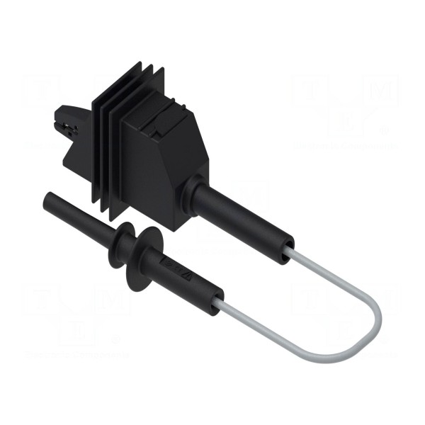 Przewód pomiarowy o długości 1 m wyposażony został w wtyk bananowy 4 mm oraz zacisk krokodylkowy. Element został zaprojektowany do pracy przy prądzie znamionowym 10 A i przekroju przewodu wynoszącym 0,5 mm².