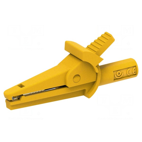 Izolacja zacisku wykonana została z polipropylenu w kolorze żółtym, a element przystosowany jest do współpracy z gniazdami o rozmiarze 2mm. Całkowita długość produktu wynosi 51mm. Zgodność z normą CAT II 600V potwierdza parametry bezpieczeństwa przewidziane dla tego typu akcesoriów pomiarowych.