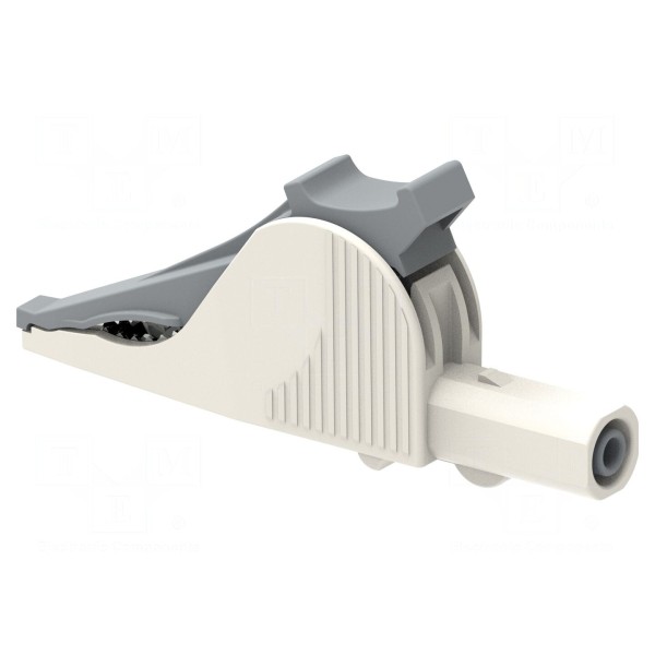 Styki urządzenia wykonane zostały z mosiądzu i poddane procesowi niklowania, co zapewnia przewodność materiału. Zacisk wyposażony jest w gniazdo o średnicy 4mm, co pozwala na kompatybilność ze standardowymi przewodami pomiarowymi. Całkowita długość elementu wynosi 93mm, a kolor obudowy to biały.
