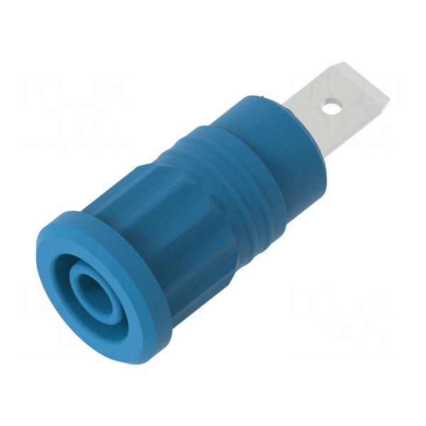 Styki złącza zostały poddane niklowaniu, co zapewnia trwałość połączenia elektrycznego. Izolowana konstrukcja elementu w kolorze niebieskim umożliwia montaż metodą lutowania, wciskany lub bezpośrednio w otworze panelu.