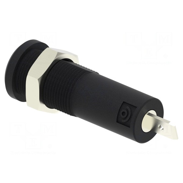 Komponent przystosowany jest do montażu typu faston, co umożliwia sprawną instalację. Produkt jest zgodny z normą bezpieczeństwa CAT 0 5000 V i występuje w kolorze czarnym.