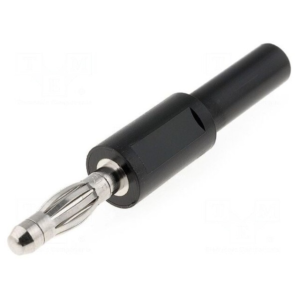 Styki złącza wykonano z mosiądzu, który został poddany procesowi niklowania, co zapewnia trwałość połączenia. Element charakteryzuje się czarnym kolorem oraz budową umożliwiającą współpracę z gniazdem bananowym 4mm.