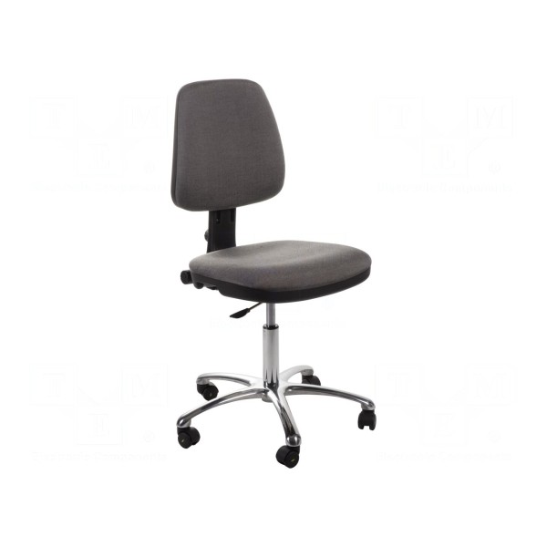 Konstrukcja opiera się na pięcioramiennej podstawie o średnicy 680mm, wykończonej polerowanym aluminium i wyposażonej w pięć przewodzących kółek. Wysokość siedziska jest regulowana w przedziale od 550 do 670mm przy pomocy amortyzatora gazowego. Zastosowane szare obicie z materiału przewodzącego oraz zintegrowany mechanizm umożliwiający regulację położenia siedziska i oparcia podnoszą komfort eksploatacji w warunkach warsztatowych i laboratoryjnych.
